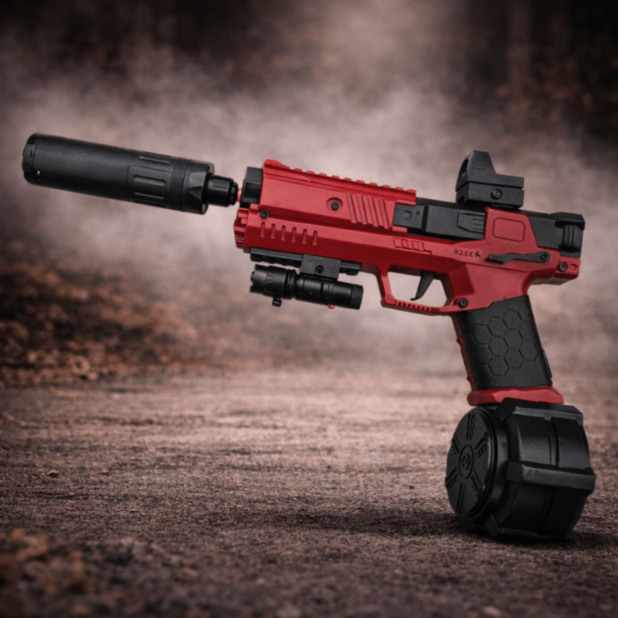 مخزن دائري (Drum Magazine): يتميز بسعة كبيرة للطلقات (كرات الجل) لزيادة وقت اللعب دون الحاجة لإعادة التعبئة المستمرة.