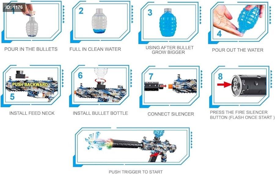الملحقات: يأتي الصندوق عادةً مع المسدس، عبوة لكرات الجل، بطارية قابلة للشحن، وكابل شحن