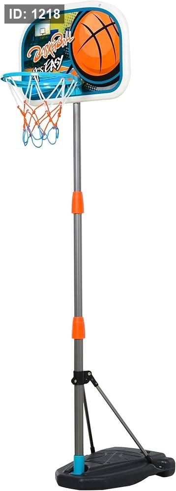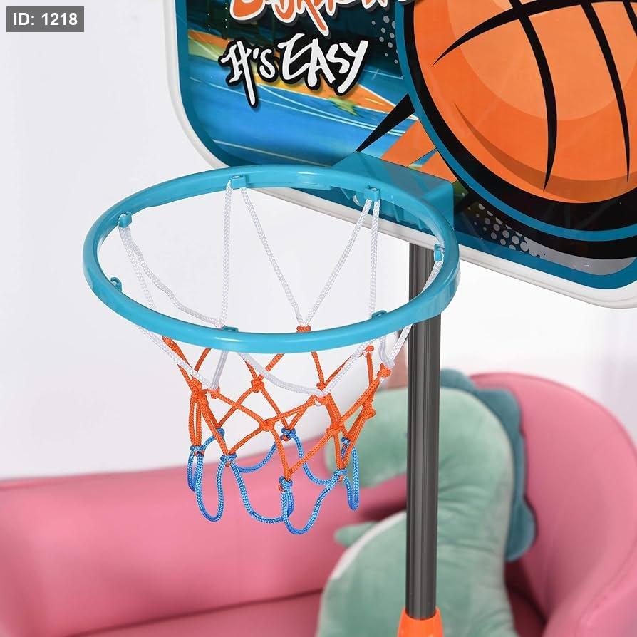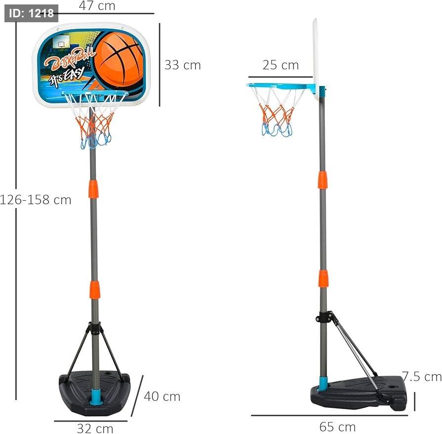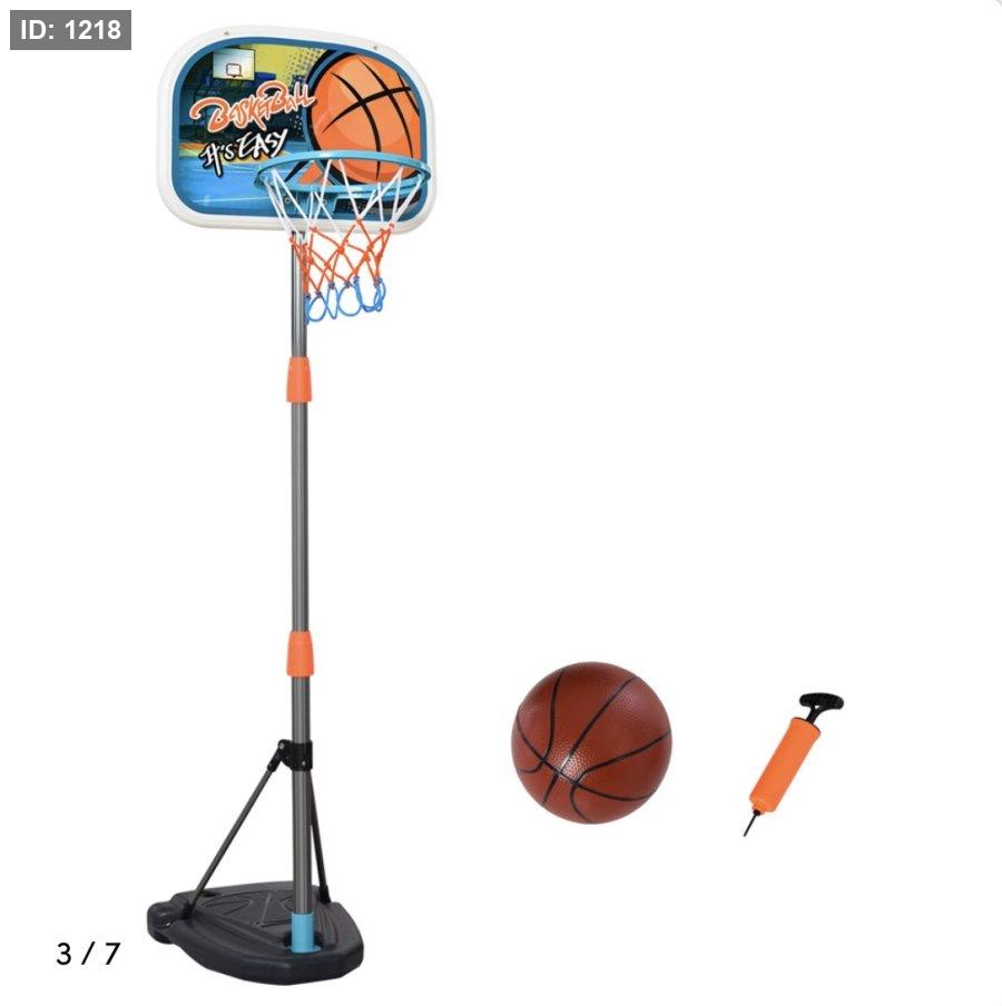 محتويات العلبة: تشتمل المجموعة عادةً على لوحة خلفية متينة، حلقة سلة مع شبكة، حامل حديدي قابل للتعديل، كرة سلة صغيرة مناسبة لأيدي الأطفال، ومنفاخ يدوي.
