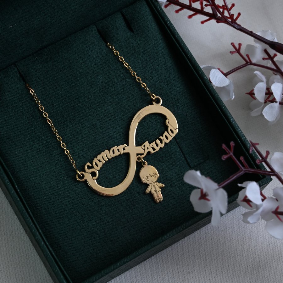 سنسال انفنتي مع اسمين و تعليقة على شكل ولد مع اسمه