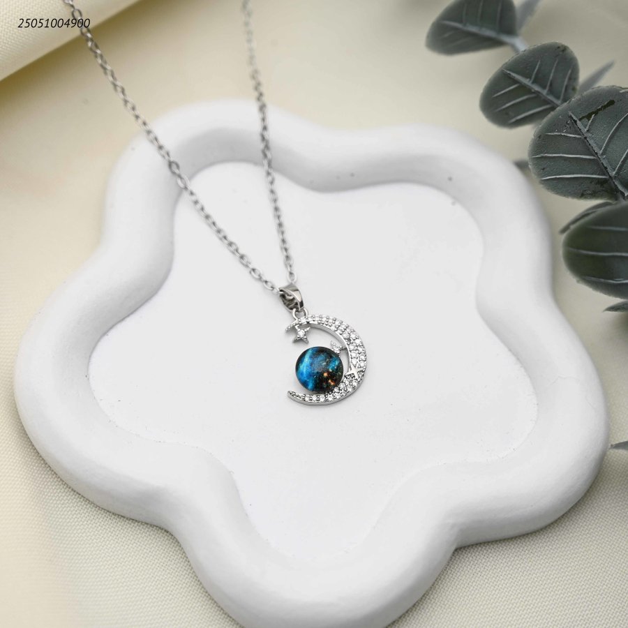 قلادة القمر والنجوم الفضية مع كرة زجاجية زرقاء وزركون