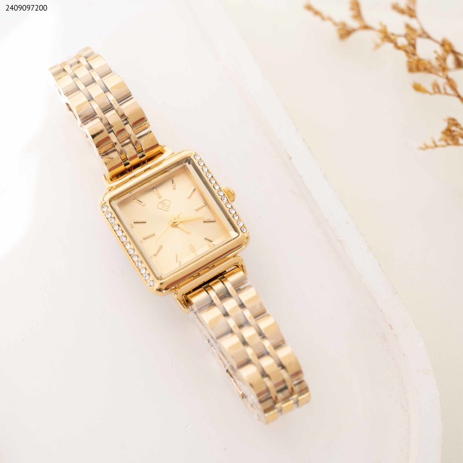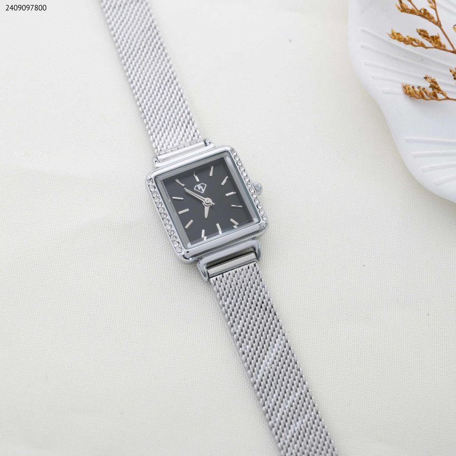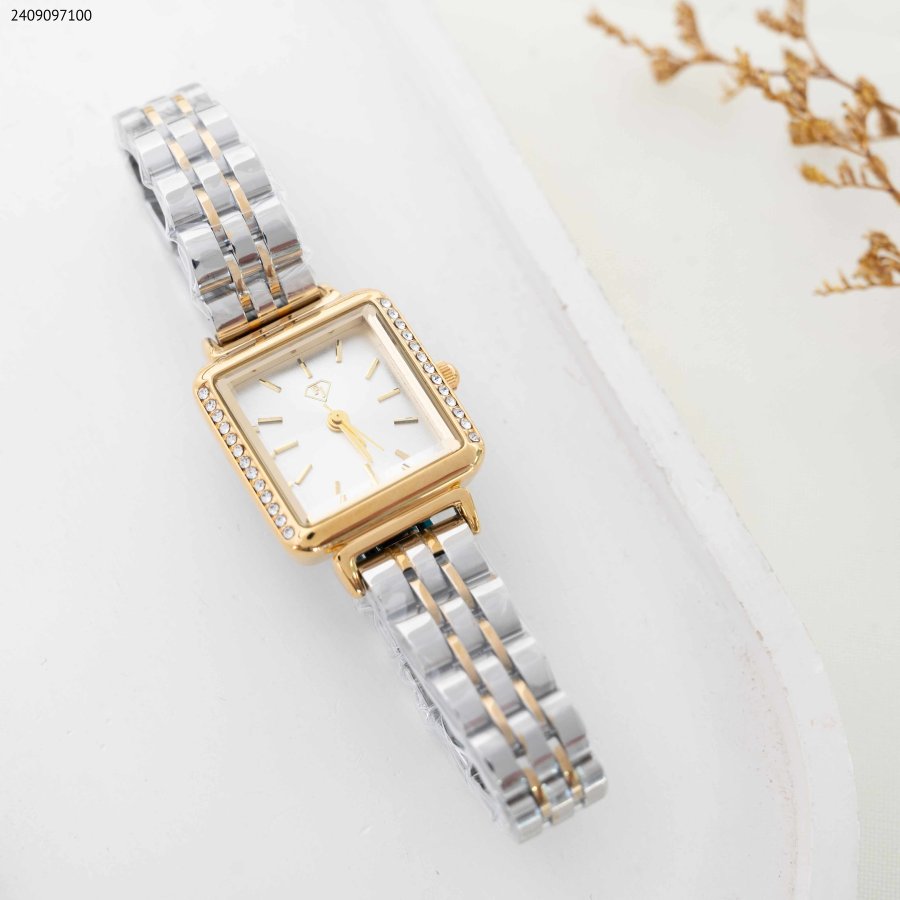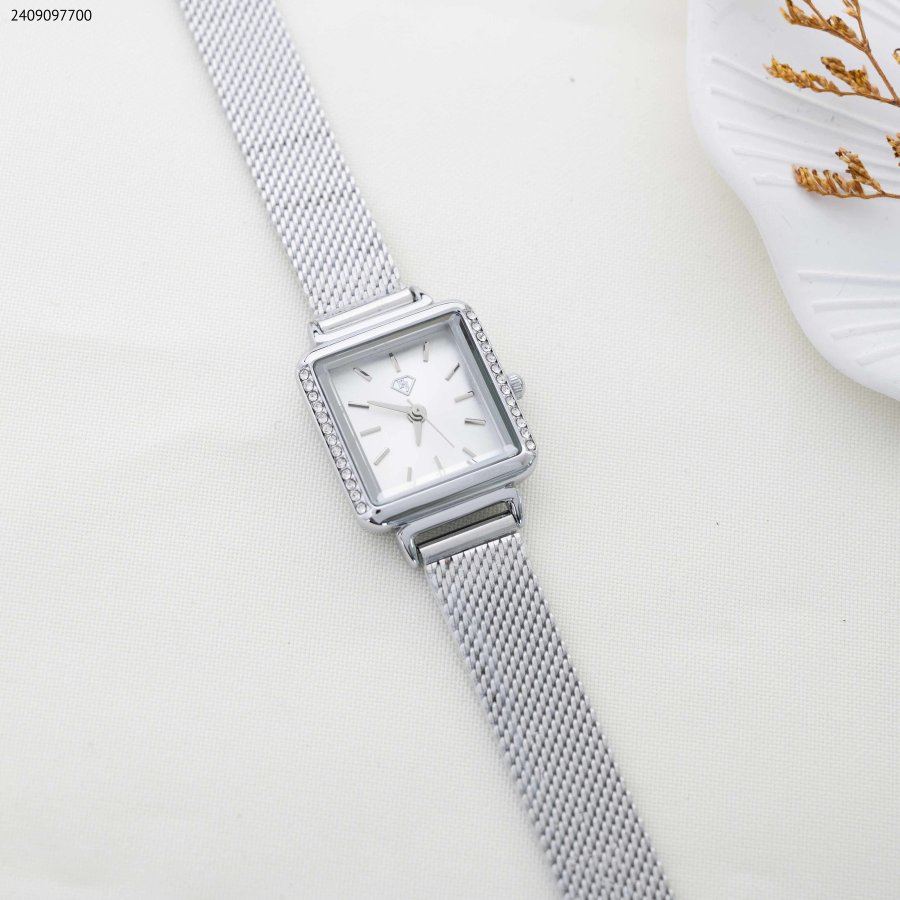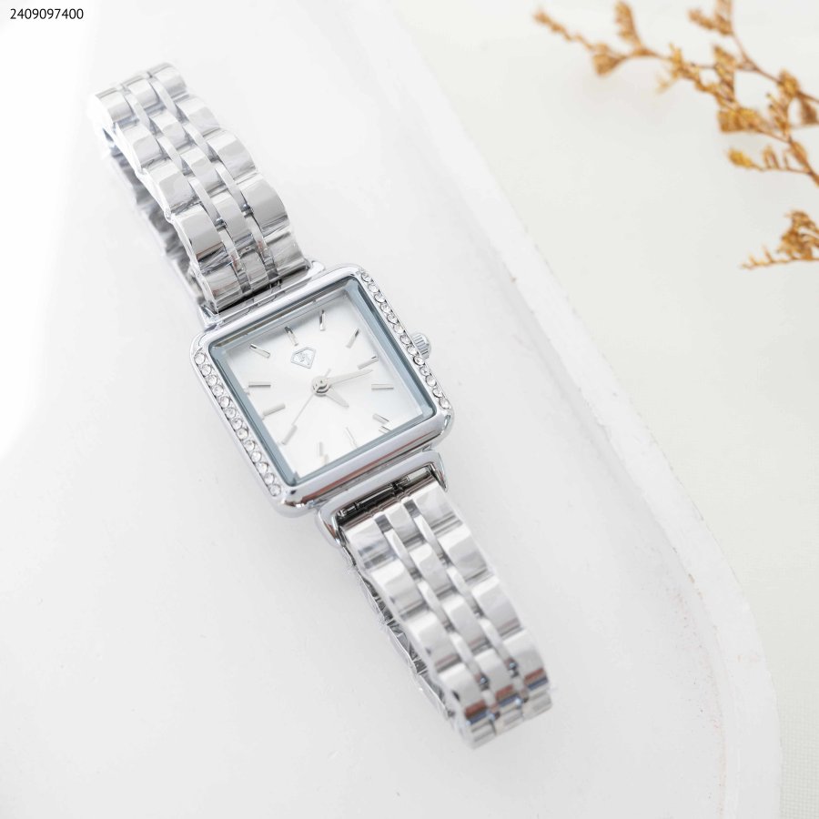 ساعة نسائية بتصميم مربع الشكل ، مزودة بحزام معدني متين وزينة من أحجار الزركون اللامعة