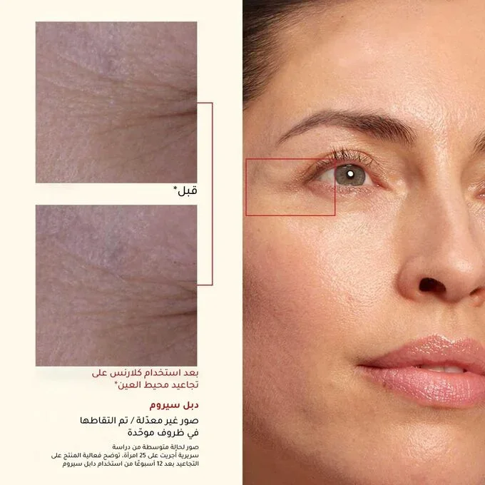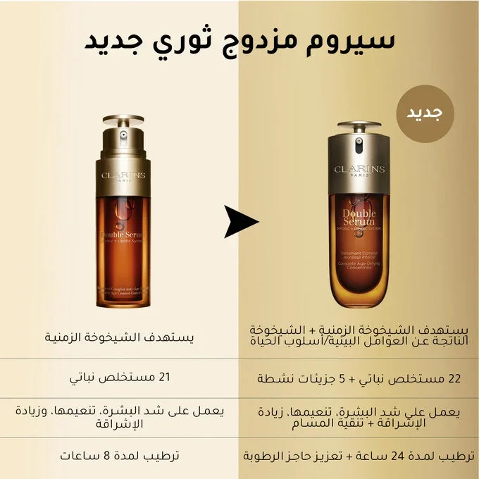 كلارنس دبل سيروم (Clarins Double Serum) الظاهر في الصورة هو منتج فرنسي شهير يُعرف بـ "سيروم المشاهير". يتميز بتركيبته المزدوجة التي تجمع بين طور مائي وطور زيتي في عبوة واحدة لتقليد بنية البشرة الطبيعية.