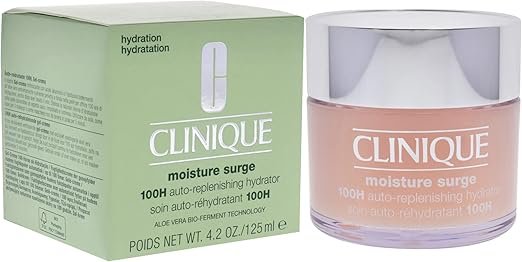 يعتبر مرطب Clinique Moisture Surge 100H Auto-Replenishing Hydrator الموضح في الصورة من أكثر منتجات "كلينيك" شهرة، وهو مرطب بقوام "جل كريم" خفيف الوزن وخالٍ من الزيوت، مصمم لتوفير ترطيب عميق يدوم حتى 100 ساعة.