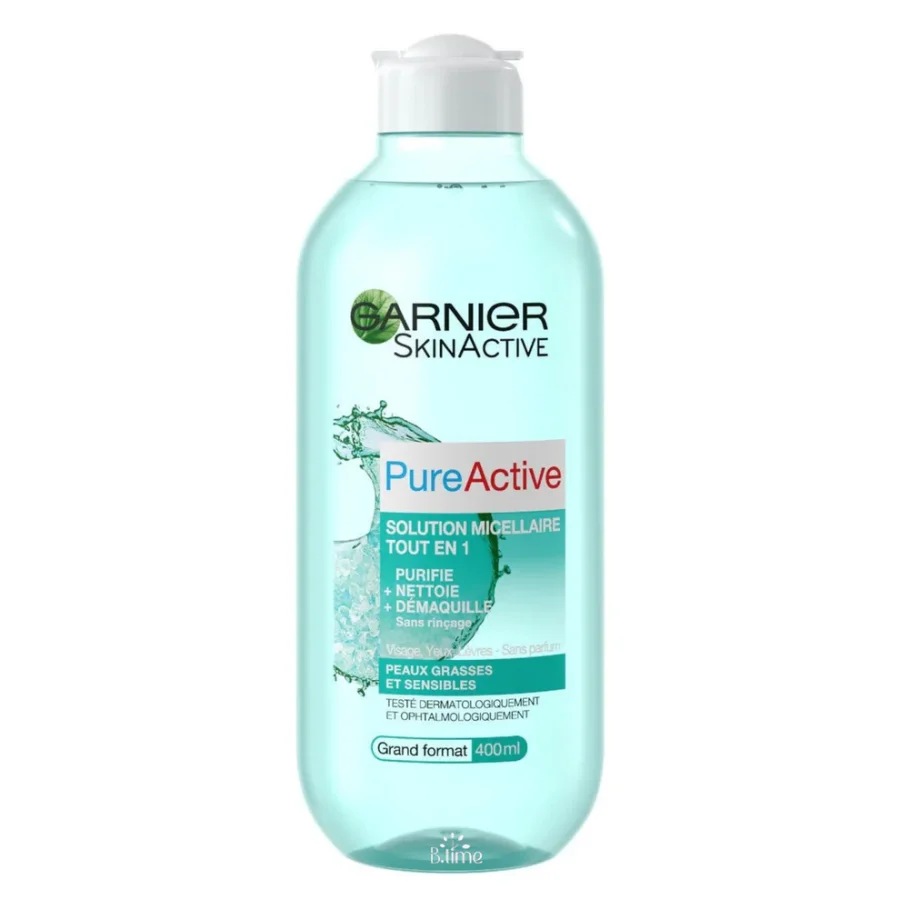 منتج جارنييه ميسيلار ووتر بيور أكتيف (Garnier SkinActive Pure Active Micellar Water) في عبوته الزرقاء (400 مل). هذا المنظف مصمم خصيصاً ليناسب البشرة المختلطة إلى الدهنية، بما في ذلك البشرة الحساسة