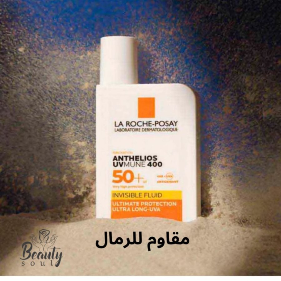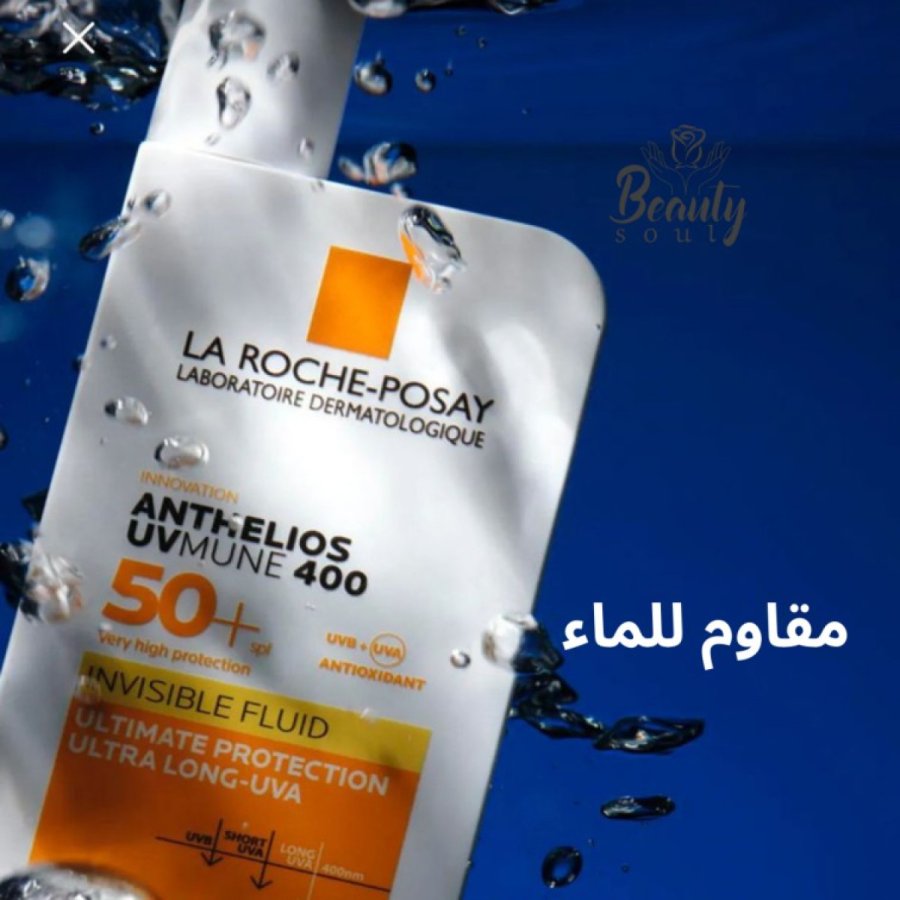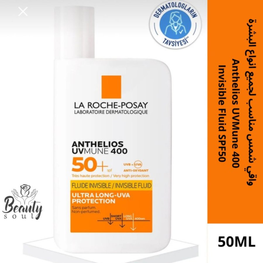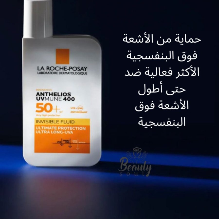 هذا المنتج هو واقي الشمس La Roche-Posay Anthelios UVMune 400 Invisible Fluid SPF50+، وهو سائل خفيف الوزن مصمم لتوفير حماية فائقة من أشعة الشمس، بما في ذلك الأشعة فوق البنفسجية الطويلة جداً (Ultra-Long UVA). تظهر الصورة النسخة التي تحتوي على عطر (Perfumed)، حيث تتوفر منه نسخة أخرى خالية من العطور للبشرة الأكثر حساسية