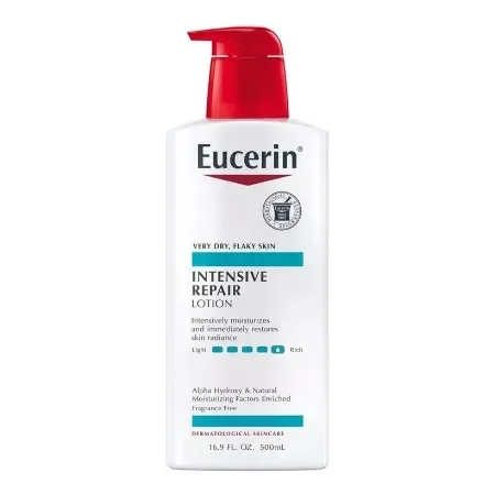يُظهر المنتج المختار لوشن يوسيرين للإصلاح المكثف (Eucerin Intensive Repair Lotion)، وهو مرطب غني مصمم خصيصاً للعناية بالبشرة شديدة الجفاف والمتقشرة.