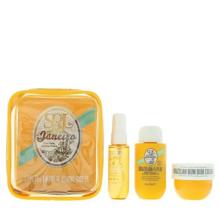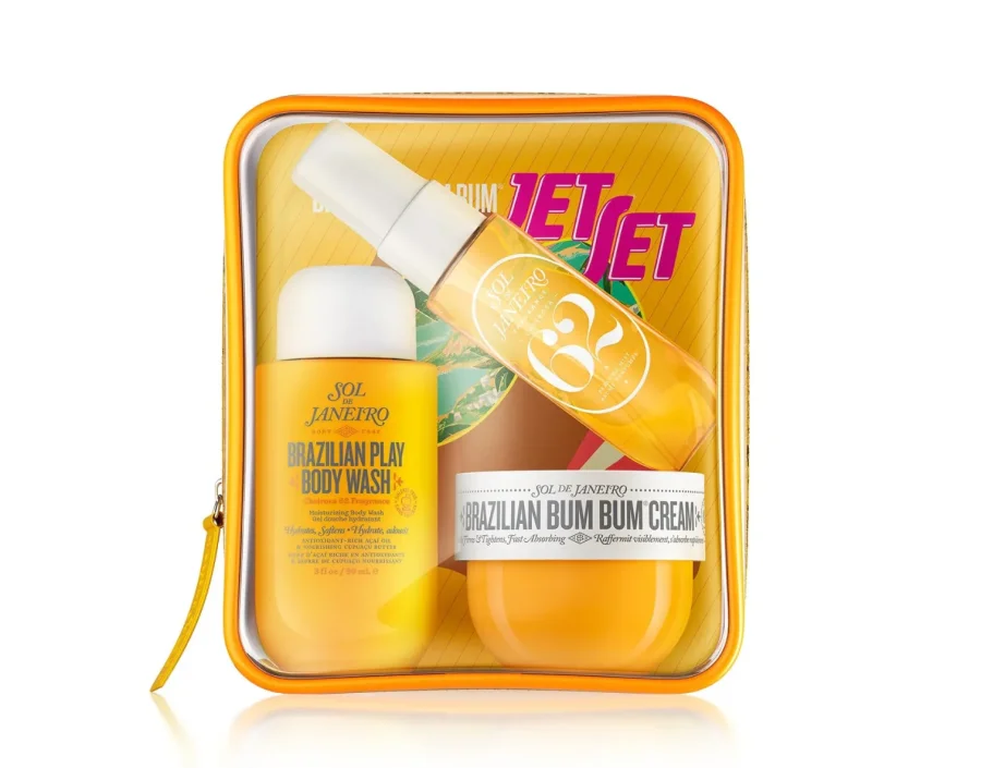 مجموعة Bum Bum Jet Set من ماركة Sol de Janeiro، وهي مجموعة مخصصة للعناية بالجسم برائحة Cheirosa '62 الاستوائية