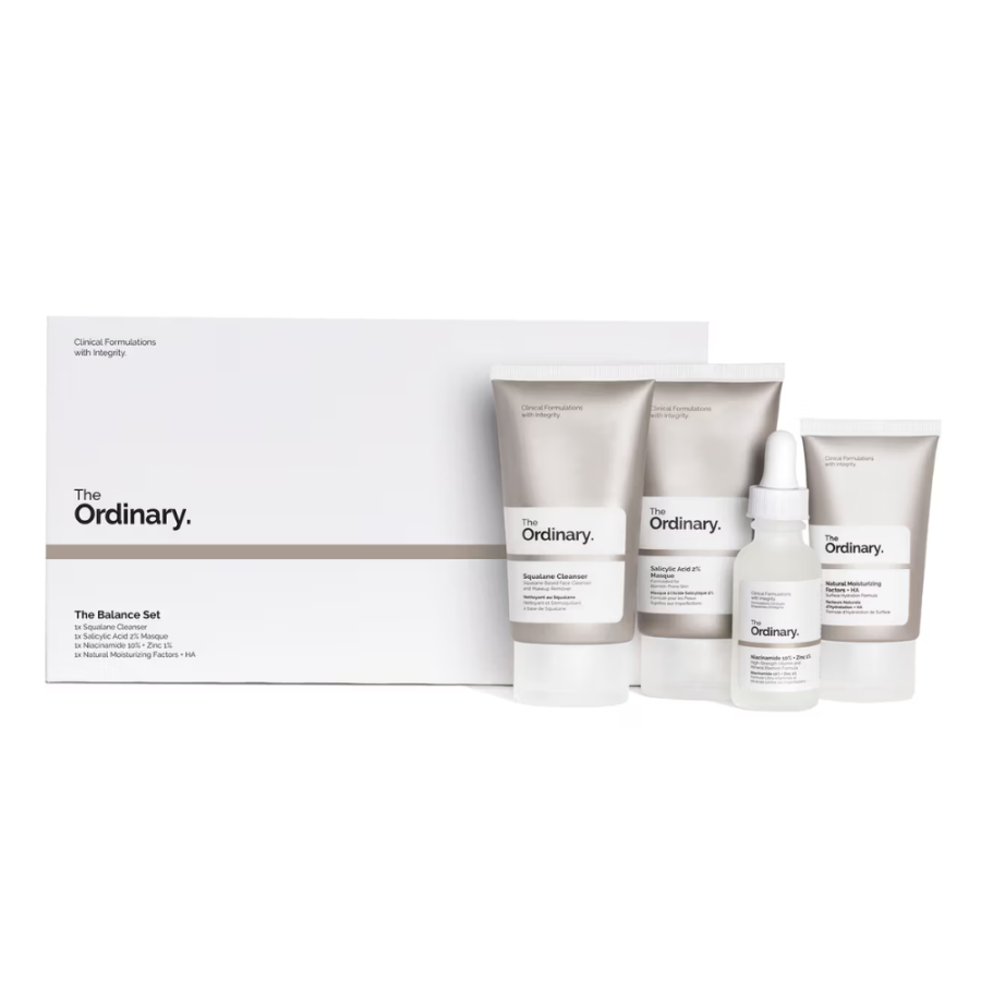 تُعرف هذه المجموعة بـ "The Balance Set" (طقم التوازن) من ماركة ذا اورديناري (The Ordinary)، وهي مصممة خصيصاً لتنظيف البشرة، تقليل اللمعان، وتحسين الملمس، مما يجعلها مثالية للبشرة الدهنية والمختلطة.