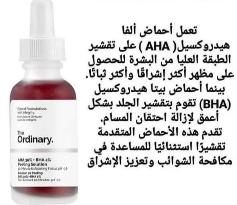 هذا المنتج هو سيروم ذا أورديناري لتقشير البشرة (AHA 30% + BHA 2%)، وهو محلول تقشير كيميائي منزلي قوي.