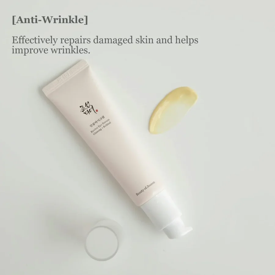 يظهر في الصورة سيروم العيون ريفايف (Revive Eye Serum) من العلامة التجارية الكورية بيوتي أوف جوسون (Beauty of Joseon)، وهو منتج مخصص للعناية بمنطقة العين الحساسة بتركيبة تجمع بين الطب التقليدي الكوري والتقنيات الحديثة.