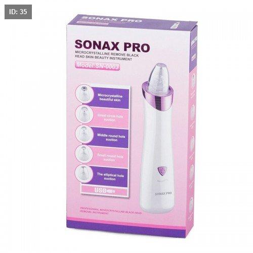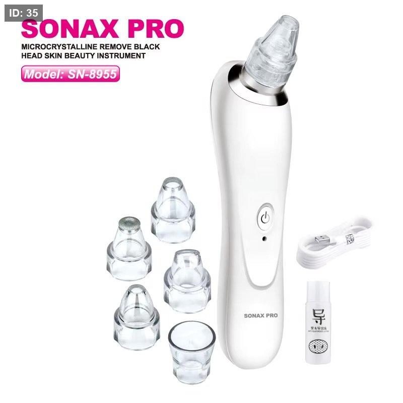 المنتج هو جهاز Sonax Pro (موديل SN-0003)، وهو جهاز كهربائي مخصص للعناية بالبشرة وتنظيفها بعمق من خلال تقنية الشفط المجهري.