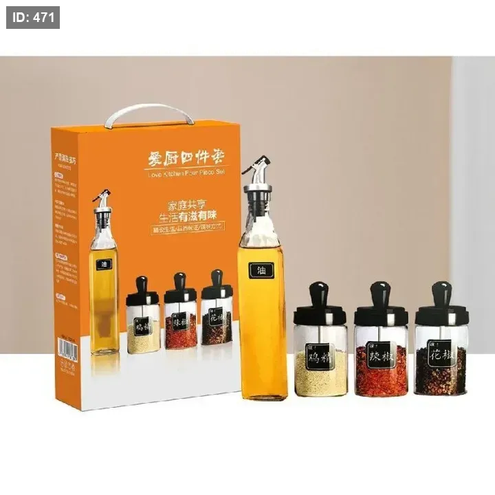 طقم مطبخ زجاجي مكون من 4 قطع من سلسلة "Love Kitchen". صُمم هذا الطقم لتنظيم الزيوت والتوابل بشكل أنيق وعملي في المطبخ.
